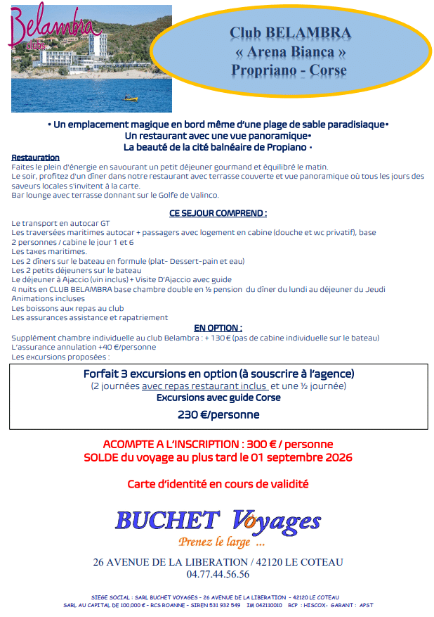 👉 Notre partenaire Buchet Voyages organise un séjour “all inclusive” en Corse du Sud du 10 au 16 octobre 2026.